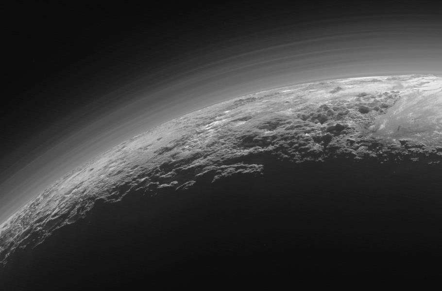 Tenká atmosféra Pluta nad pánví Sputnik Planitia. (foto: Wikimedia Commons, NASA, CC BY 4.0)