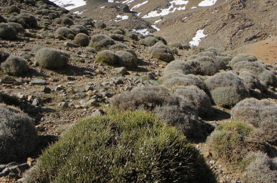 Naším jasným prvotním cílem je výrazné sedlo, kam je nutné prodrat se trnitými porosty. Ty jsou tvořené především pravděpodobně trsy pryšců a keřů Retama, mezi nimiž můžeme rozeznat mnoho dalších zástupců zdejší flory, jakými jsou skalničky Alyseeum spinossum s nádherně fialovými květy nebo vzácněji místní endemity (např. Polygala Balausae nebo Bupleurum spinosum).