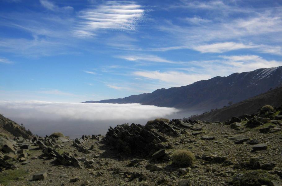 Masív Djebel Ayachi je od Mideltu vzdálen dobrých 30 kilometrů, a tak přijímáme nabídku odvozu blíže k horám. Zadarmo to samozřejmě nebude, ale dohodnutá částka nikoho nezruinuje. Počasí se po propršených dnech stále nechce vzpamatovat a tak už nás neudivuje, že jakmile dorazíme k úpatí hor, spouští se drobný déšť. I za těchto podmínek se ale těšíme na první cíl našeho pobytu v horách – impozantní kotlinu Cirque de Jaffar.