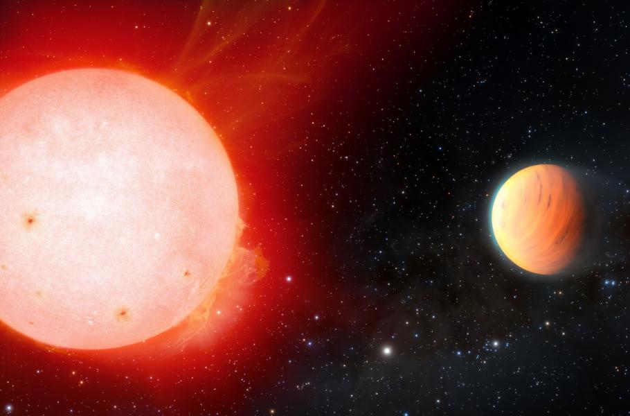 Vizualizace extrémně řídkého plynného obra TOI-3757 b a jeho mateřské hvězdy. (ilustrace: NOIRLab, NSF, AURA, J. da Silva, M. Zamani, CC BY-SA 4.0)