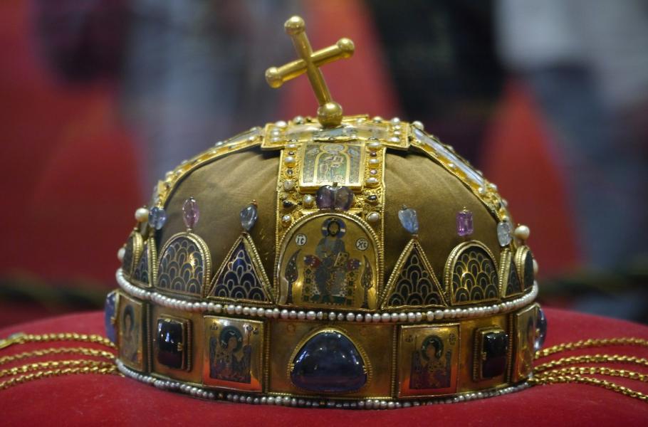 Nakloněný kříž na uherské koruně vznikl během krádeže, kterou nařídila matka Ladislava Pohrobka. Podle jiné legendy byl kříž ohnut záměrně Habsburky, aby zlomili „magické síly“, jež Maďaři své koruně přisuzovali a podle dalších má nakloněný kříž znamenat poklonu před Bohem.(foto: Wikimedia Commons, Zairon, CC BY-SA 3.0)