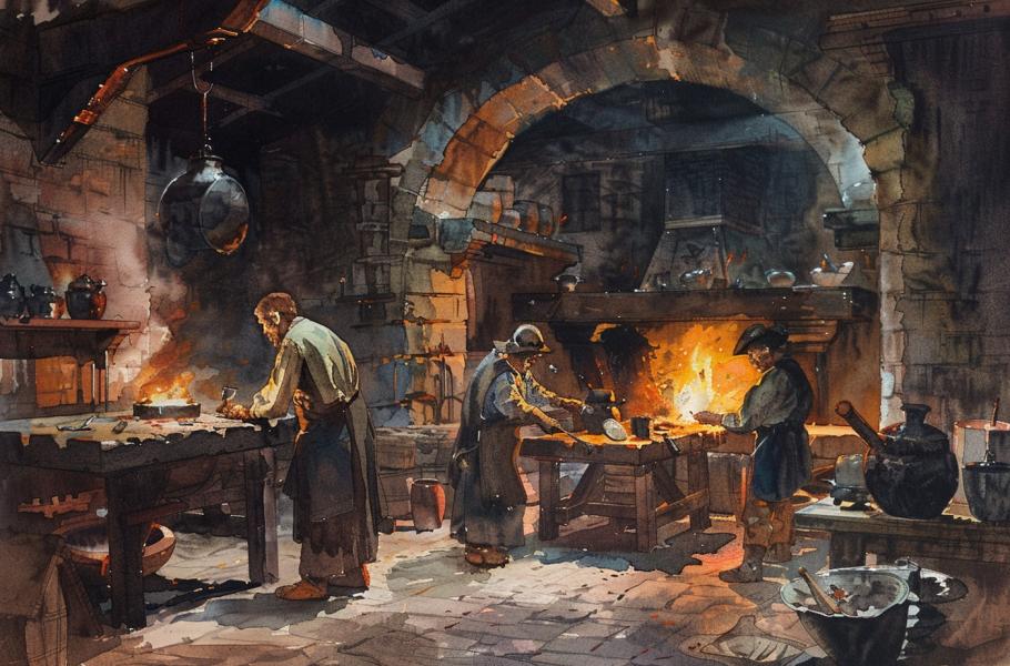 Rychle se rozrůstající Praha jistě spotřebovávala obrovské množství železa a výrobků z něj. (ilustrace: Midjourney AI, PDM 1.0)