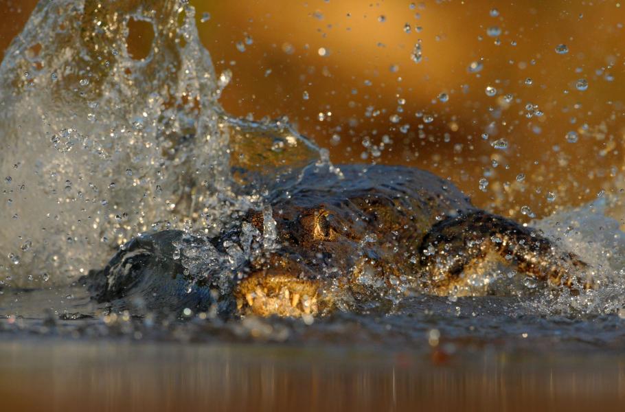 Jenže mě baví poznávat přírodu opravdu zblízka. A protože je kajman na první pohled zvíře poměrně nudné, trochu mě trápila myšlenka, jak jej pro fotografování trochu rozpohybovat. Pár dní jsem zubatce studoval, udělali jsme několik cvičných pokusů a začínal jsem cítit, že by to šlo. Po dvou dnech jsem na řece konečně našel nehluboké místo, kam půjdou i ty úplně poslední sluneční paprsky. Nevěděl jsem ale, jak kajmanům naznačit, že zrovna tady je nejlepší místo na focení.