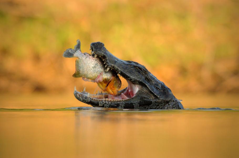 Krokodýli žijí na Zemi bez větších změn již sto milionů let. Jejich typický svalnatý ocas, podlouhlé čelisti s ostrými zuby a jedinečná síla jsou vlastní i kajmanům yacaré, kteří tak jsou velkou atrakcí Pantanalu. Obvykle se s nimi můžete setkat, jak tiše plavou těsně pod hladinou – z dva až tři metry dlouhého těla v tom okamžiku vyčuhuje pouze špička čumáku a nozdry. Někdy kajmani dokonce využívají přírodních krytů. Schovávají se například za rostliny kvetoucí na hladině, jako jsou třeba vodní hyacinty (Eichhornia crassipes). Ke kořisti se tak dostanou co nejblíž, aniž by sami byli spatřeni.