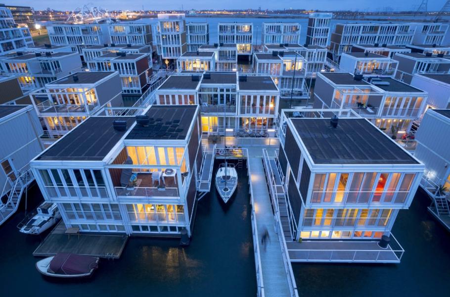 Na východě Amsterdamu roste nová obytná čtvrť. Nejde ale o běžnou zástavbu – Waterbuurt, jak se nové čtvrti přezdívá, totiž vyrůstá na vodní hladině. Na rozdíl od hausbótů jde o plně stacionární obydlí, která jsou připevněná k ocelovým pilotům a přístupná z mola. S měnící se výškou hladiny jezera IJmeer se tak nové domy pohybují jen po svislé ose.