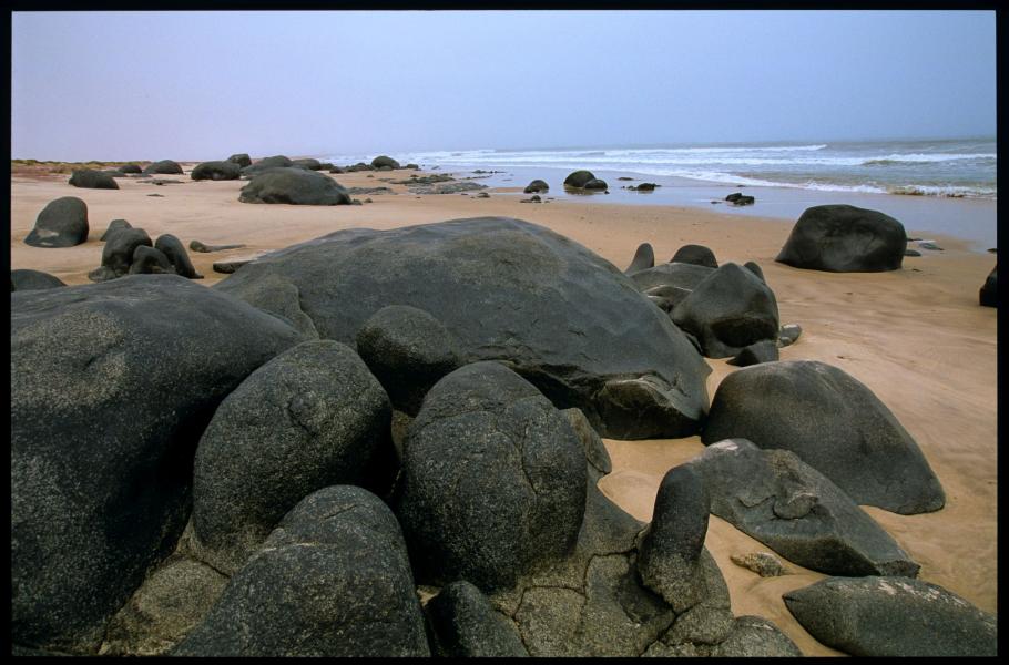Skalnatopísečná a prašná poušť přechází po celé své délce v nekonečně dlouhý, mírně se svažující písečný břeh. Protože se tu střetává studený Bengálský mořský proud s horkým kontinentem, bývá moře velmi neklidné a břeh se halí často do mlhy. Právě zrádné písčité mělčiny, mlhy a bouře byly odedávna příčinou mimořádně velkého množství lodních katastrof. Zdejší studené vody byly vždy velmi bohaté na ryby, takže pobřeží bylo většinou poseto vraky rybářských a velrybářských lodí. Občas se pod kola osudu připletl i nějaký ten dobrodruh nebo válečná loď.