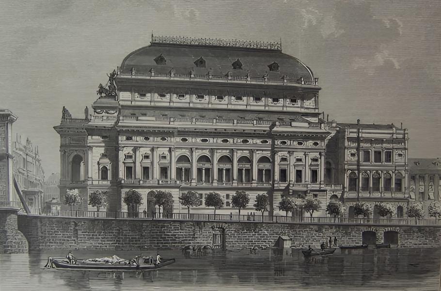Národní divadlo v Praze. Dřevořez podle fotografického snímku F. Fridricha z roku 1881. (ilustrace: Wikimedia Commons, PDM 1.0)