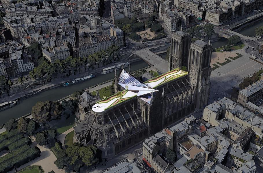 Samozřejmě šlo spíš o nadsázku než vážně míněný návrh, což se ovšem nedá říct o představě belgického architekta Vincenta Callebauta, jenž chtěl na střeše svatostánku vybudovat obří akvaponický skleník s průhlednými solárními panely. Uvnitř by tak vznikly ideální podmínky pro pěstování ovoce i zeleniny a roční výnosy prý měly dosáhnout až jednadvaceti tun. Díky fotovoltaice by byl navíc Notre-Dame energeticky soběstačný a jeho produkce by pokryla i spotřebu okolních domů.