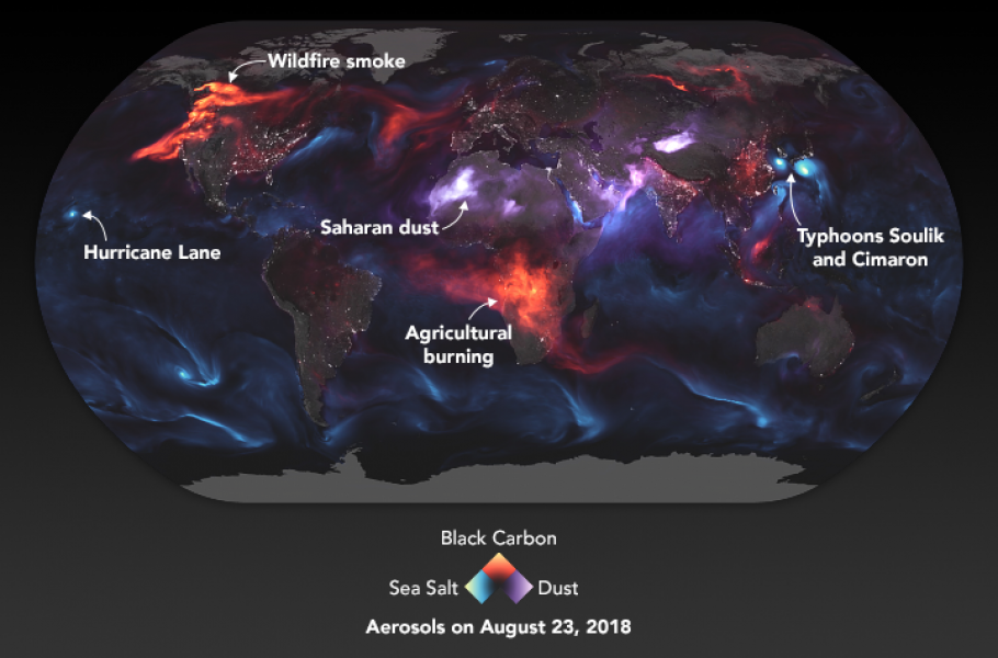 Při každém nádechu se nám do plic dostávají nepatrné částečky z okolního prostředí. Pocházejí z aerosolů, ať už lidského nebo přírodního původu. Nová úchvatná vizualizace zemské atmosféry z dílny NASA ukazuje, jak to bylo s aerosoly v atmosféře před pár dny, ve čtvrtek 23. srpna 2018.