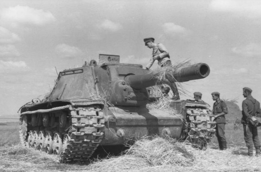Němci zkoumají SU-152 ukořistěný na východní frontě. Na tomto typu bojoval také Nikolaj Šiškin. (foto: Wikimedia Commons, Bundesarchiv, Dreyer, CC-BY-SA 3.0)