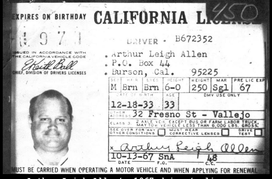 Policejní složky obsahovaly 2 500 podezřelých, doposud nejvíce v historii u jednoho případu. Jméno hlavního adepta znělo Arthur Leigh Allen. Pro nedostatek přímých důkazů však nikdy nebyl obviněn, i když se o to přesvědčení vyšetřovatelé několikrát pokoušeli. Měli k tomu hned několik pádných důvodů. Předně ho na fotografii poznal Michael Mageau, který Zodiakův útok zázrakem přežil. Nápadné byly i výpovědi Allenových známých. „Na začátku roku 1968 mi řekl, že je fascinovaný myšlenkou honu na lidi. Prý je to lepší než lovit zvířata, protože lidi jsou inteligentnější,“ prozradil jeden z nich. V rozhovoru se svým bývalým kolegou Donem Cheneym byl Allen ještě sdílnější. „V opilosti vykládal, že by mohl zabíjet náhodně vybrané páry, klidně v noci s baterkou připevněnou na své pistoli. Poté by psal na policii výsměšné dopisy s detaily svých vražd,“ vypověděl Cheney.