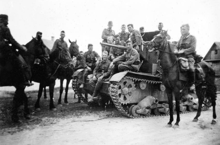 Němečtí vojáci pózují u ukořistěného sovětského tanku T-26. (foto: Wikimedia Commons, PDM 1.0)