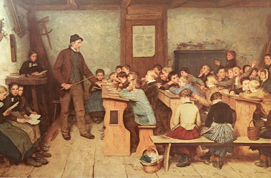 Během vlády Marie Terezie nebylo reálně možné prosadit školní docházku pro všechny děti, neboť neexistoval dostatek škol a učitelů. (ilustrace: Wikimedia Commons, Albert Anker, PDM 1.0)