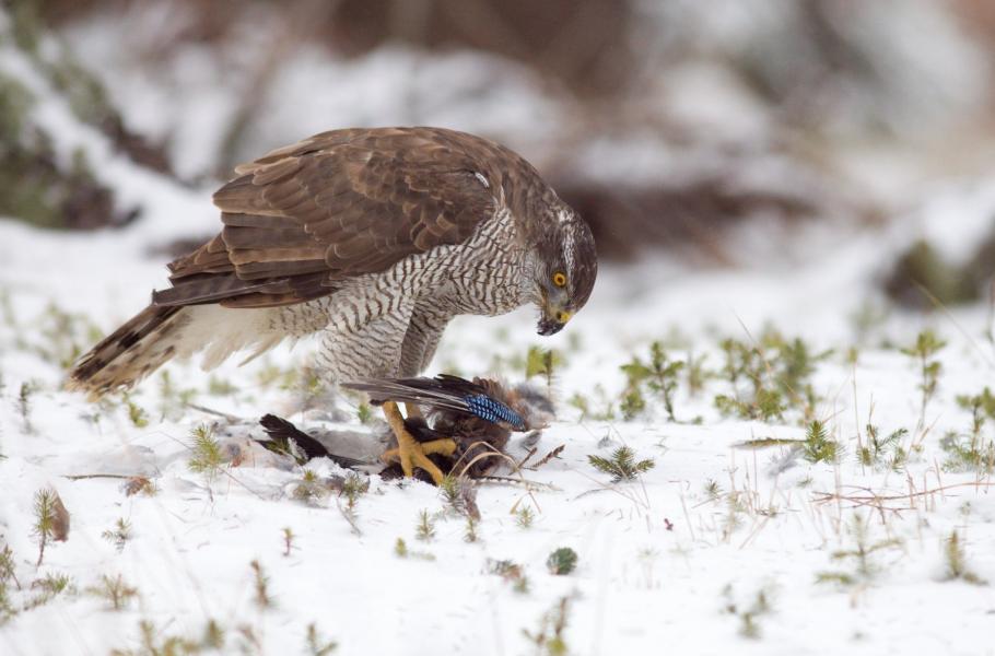 - Potrava: Různí ptáci (sojky, straky, drozdovití, hřivnáči, aj.) a drobní savci až do velikosti zajíce (ty však dokážou ulovit jen silné samice).