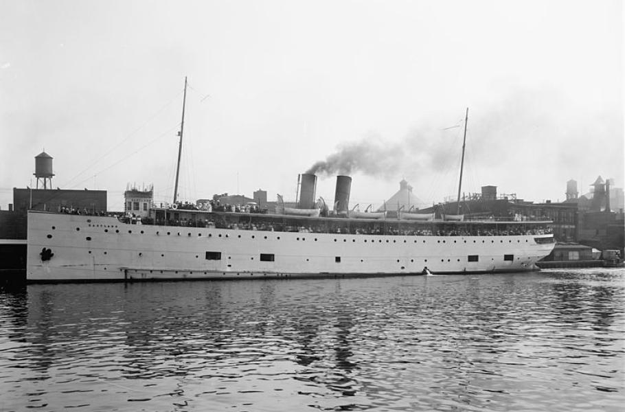 Dobová fotografie zachycuje parník Eastland, který sloužil jako výletní loď. Do dějin se ale zapsal kvůli tragické nehodě, která se přihodila v chicagském přístavu.