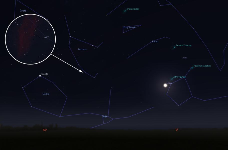 Nyní už se však věnujme slíbené Kalifornii. Místo, kde se na nočním nebi nachází, naleznete hravě. V první polovině noci nasměrujte pohled nad východní obzor do souhvězdí Persea a vyhledejte jeho 12. nejjasnější stálici Menkhib alias Ksí Persei (viz Hvězdný obr). Tato hvězda čtvrté velikosti je dobře viditelná i očima a od ní už zbývá do Kalifornie jen kousek – přesněji řečeno necelý úhlový stupeň směrem k další nápadné stálici, Epsilon Persei.