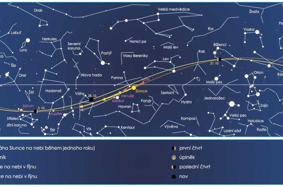 Začnete-li s pozorováním už krátce po západu Slunce, můžete se na nebi věnovat také dvojici jasných planet nad jihem až jihozápadem – Saturnu v souhvězdí Střelce a Jupiteru v Hadonoši. Obě zapadají ještě před půlnocí a v průběhu října se na obloze do jejich těsné blízkosti dostane rovněž dorůstající srpek Měsíce (viz Zajímavé úkazy). Když už jsme u planet, nesmíme zapomenout na Mars, který se po čtvrt roce stává opět pozorovatelným. Spatřit jej však můžete teprve na sklonku října na ranním nebi, nízko nad východním obzorem v souhvězdí Panny.