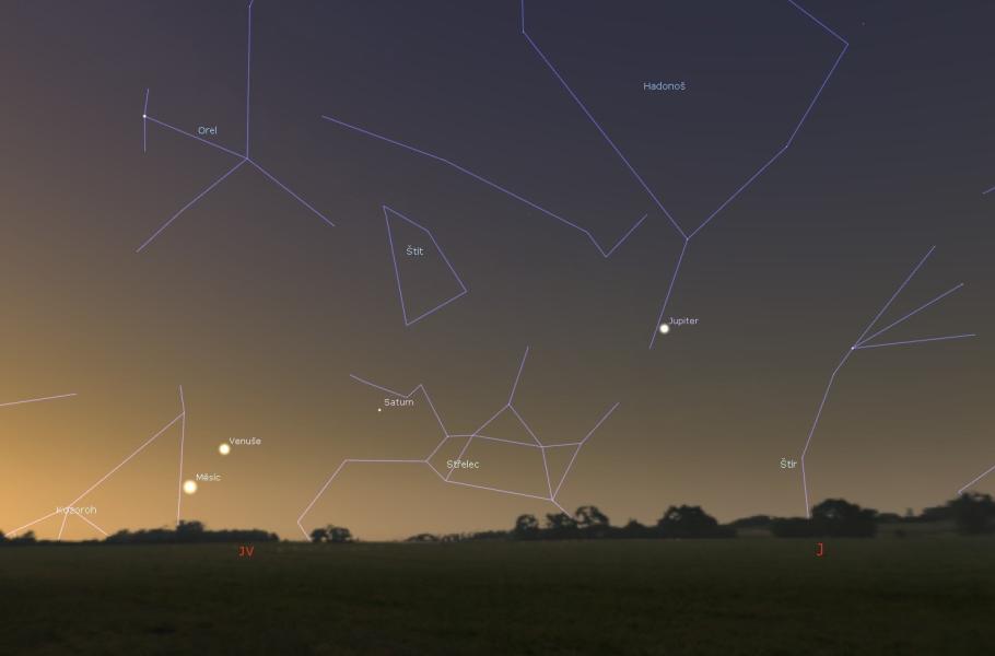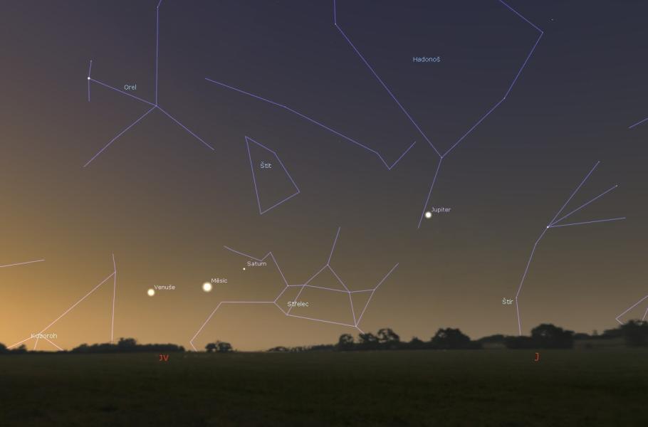 Jak už asi tušíte, jedná se o objekty z říše planet. Nejvýš nad horizontem a také nejvíc nad jihem zahlédnete žlutobílý Jupiter v souhvězdí Hadonoše. Vydáte-li se doleva a níž k obzoru, narazíte nejdřív na nažloutlý Saturn ve Střelci a posléze i na blyštivou Venuši na pomezí Střelce a Kozoroha. Poloha Měsíce se bude měnit s každým dnem: 1. března jej uvidíte mezi Jupiterem a Saturnem, 2. března mezi Saturnem a Venuší a konečně 3. března mezi Venuší a jihovýchodním horizontem. Pro úplnost dodejme, že napravo od krále planet bude na obloze patrná i jasná stálice Antares ze souhvězdí Štíra.