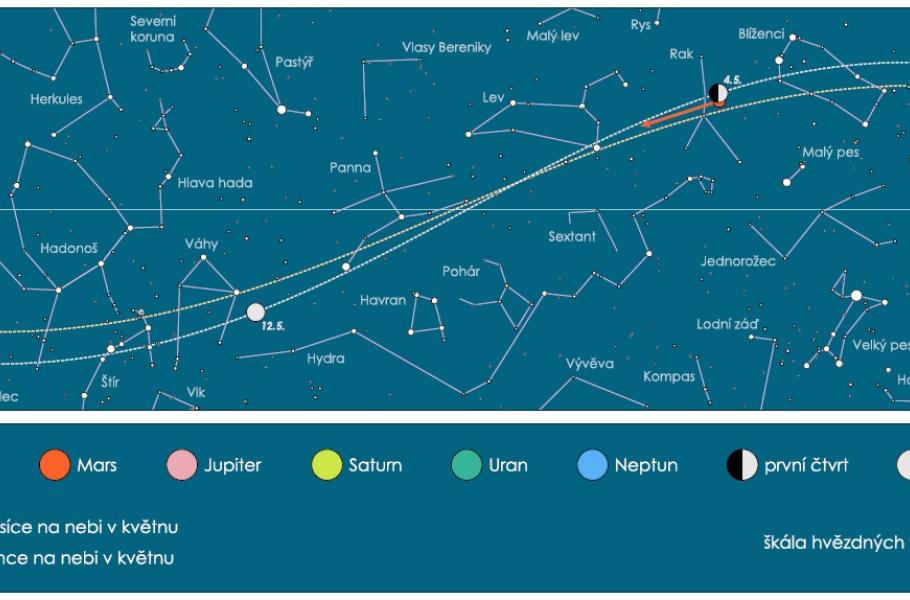 Májové nebe oživí zejména úkazy spojené s tělesy Sluneční soustavy. Ty nejnápadnější, snadno viditelné i bez dalekohledu, se přitom vážou k Marsu: Prvního z nich se dočkáme již 3. května ve večerních hodinách, kdy oranžová planeta získá dočasnou ozdobu v podobě Měsíce v první čtvrti. V průběhu noci klesne jejich úhlová vzdálenost až na 1°, stane se tak ovšem těsně před tím, než v brzkých ranních hodinách zapadnou za obzor.