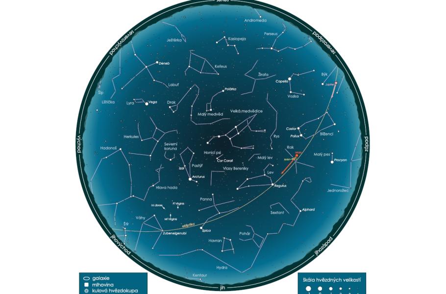 Napříč květnem můžete zkusit „pronásledovat“ planetku Vesta, která se 2. května dostane do opozice se Sluncem. Na počátku měsíce se tudíž dočkáme velmi příznivých pozorovacích podmínek, kdy nejjasnější z asteroidů setrvá nad obzorem celou noc, a navíc v plném lesku. V prvních květnových dnech dosáhne jasnost Vesty letošního maxima a vystoupá až na 5,6 mag. Teoreticky se tedy ocitne i v dosahu neozbrojeného pohledu, ale kvůli všudypřítomnému světelnému smogu bude jistější použít alespoň malý dalekohled. S pozorováním každopádně neotálejte, protože po zbytek měsíce bude planetka už jen slábnout a v jeho závěru klesne její jasnost na 6,4 mag. Roli sehraje i rušivý svit měsíčního kotouče, který 12. května dospěje nedaleko Vesty do úplňku.