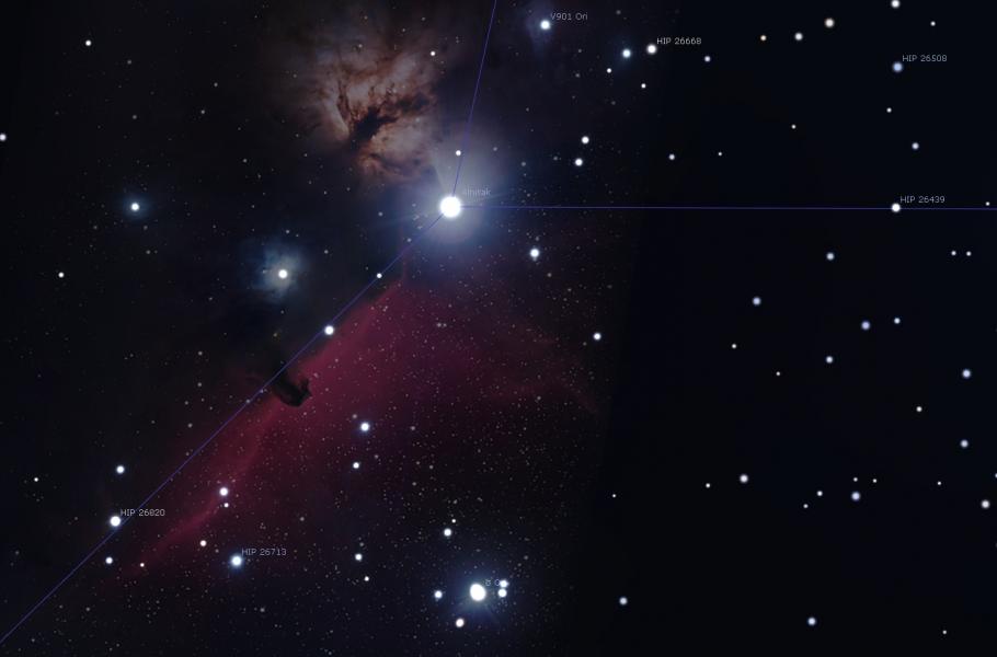 Od Orionova pásu se vydejte na sever za nápadnou hvězdou Lambda Orionis neboli Meissa, která představuje lovcovu hlavu. V dalekohledu se rozpadne na dvě složky s 3,4 a 5,6 mag, vzdálené asi 4,3″. Naopak nejvýchodněji položená stálice pásu – Zéta Orionis alias Alnitak – se stane prubířským kamenem. Na obloze ji samozřejmě naleznete hravě, vždyť její nejjasnější složka má 1,9 mag. Abyste však spatřili jejího průvodce čtvrté hvězdné velikosti, vzdáleného pouze 2,2″, musíte si vzít na pomoc dalekohled s objektivem o průměru alespoň 10 cm a s dostatečným zvětšením. Nicméně v takovém přístroji už zahlédnete i třetí členku soustavy s 9,5 mag, doprovázející zmíněný těsný pár v úhlové vzdálenosti 58″.