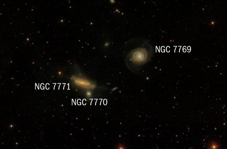 Pouhých 5′ na jihovýchod pak objevíte podobně jasnou, avšak výrazně protáhlou NGC 7771 s 12,3 mag. Největší výzvou bude poslední z trojice, slaboučká NGC 7770 s 13,8 mag. Coby drobný flíček se nachází jižně přímo pod NGC 7771. Pozorování naznačují, že by danou trojici mohlo pojit vzájemné gravitační působení. Všechny zmíněné galaxie se totiž nacházejí zhruba stejně daleko od Země.