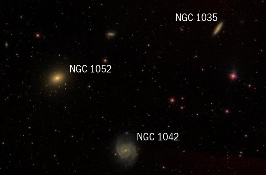 Za dalším galaktickým triem se přesuňte do jihovýchodního cípu souhvězdí Velryby, poblíž hranice se sousedním souhvězdím Eridanu. Právě tam se nachází triplet složený z galaxií NGC 1035, NGC 1042 a NGC 1052. Nejnápadnější stálici v jeho blízkosti představuje Éta Eridani, kterou na nebi snadno dohledáte i bez dalekohledu. Od ní se přesuňte 4° na západ a trojice hvězdných ostrovů, rozmístěných do vrcholů rovnoramenného trojúhelníku, by se měla objevit v zorném poli vašeho přístroje.