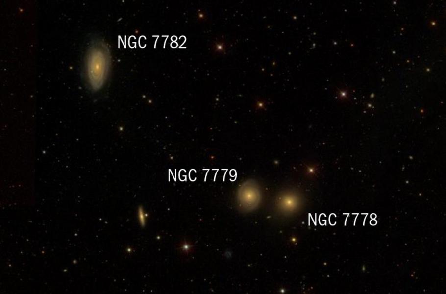 Poslední pohledný triplet, složený z NGC 7782, NGC 7778 a NGC 7779, okupuje souhvězdí Ryb nedaleko stálice čtvrté velikosti Omega Piscium. Od ní se vydejte 1,75° na severozápad a jako první vám nejspíš padne do oka dvojice přibližně stejně jasných kruhových galaxií NGC 7779 a NGC 7778 (obě s 12,7 mag).