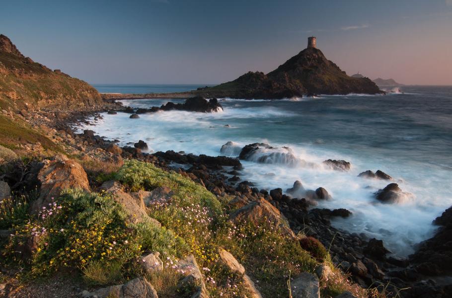 Jedny z mnoha menších ostrovů při pobřeží Korsiky. Tyto se jmenují Krvavé ostrovy a kdysi prý na nich sídlili korzáři. Na ostrůvku je jedna ze strážních věží pocházející ze 17. století (Foto: Shutterstock)