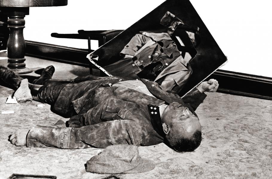 Činovník německé lidové domobrany se zničeným portrétem vůdce. (foto: Shutterstock)