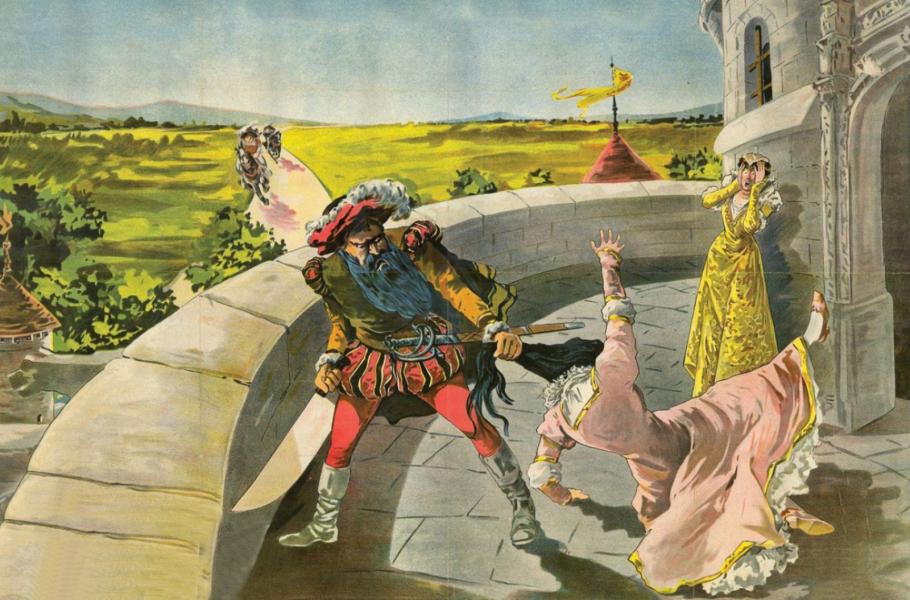 Plakát ilustrátora Henriho Graye k filmu Modrovous z roku 1907 v režii Étienna Arnauda. (zdroj: Wikimedia Commons, Henri Boulanger aka Henri Gray, CC0)