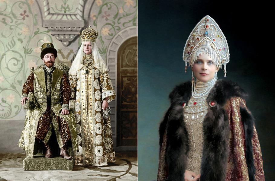Mikuláš II. sedí na slonovinovém trůnu Ivana IV. Hrozného v obřadním rouchu cara Alexeje I. Michajloviče, Alexandra Fjodorovna zvaná Alix oblékla róbu Alexejovy manželky Marie Iljiničny Miloslavské. Princezna Zinaida Jusupovová (vpravo) byla jednou ze sólových tanečnic při úvodním vystoupení – tradiční ruské tance totiž mistrovsky ovládala.
