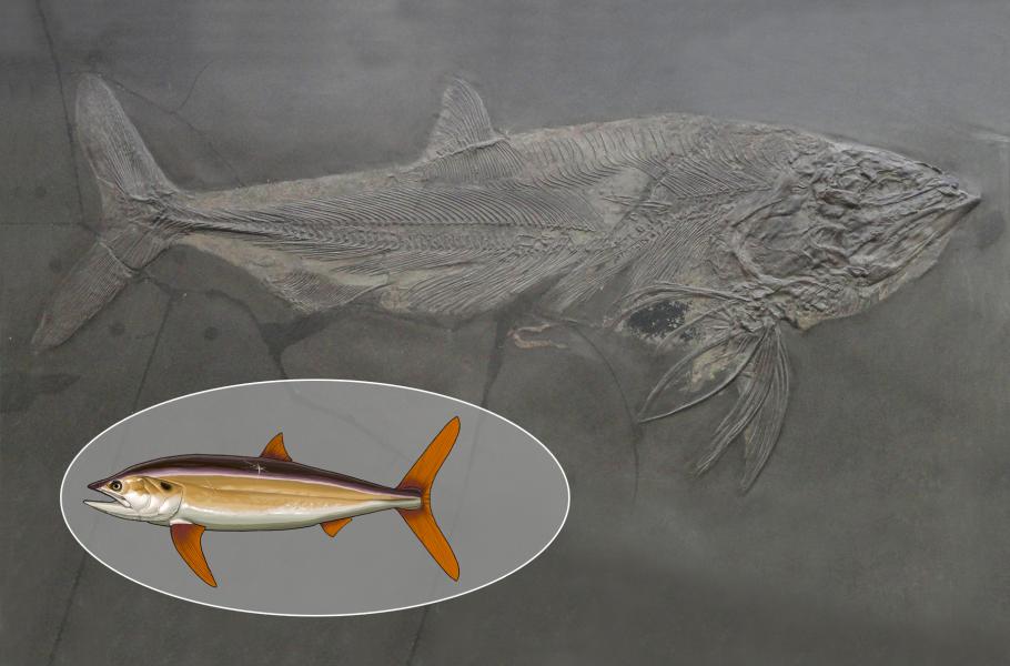 Fosilie ryby druhu Pachycormus v přírodovědeckém muzeu ve Frankfurtu nad Mohanem. (zdroj: Wikimedia Commons, Daderot, CC0 1.0 + ilustrace CC BY-SA 4.0)