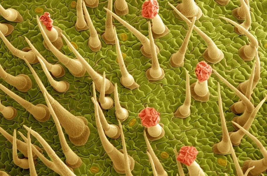 Mysteriózní krajina na tomto snímku z elektronového mikroskopu není nic jiného než obyčejný list rajčete jedlého (Solanum lycopersicum). List je pokryt dvěma různými druhy chloupků, přičemž ty červeně vybarvené vylučují olej. Oba typy rostlinu chrání proti býložravcům a zabraňují ztrátě vody způsobené odpařováním.
