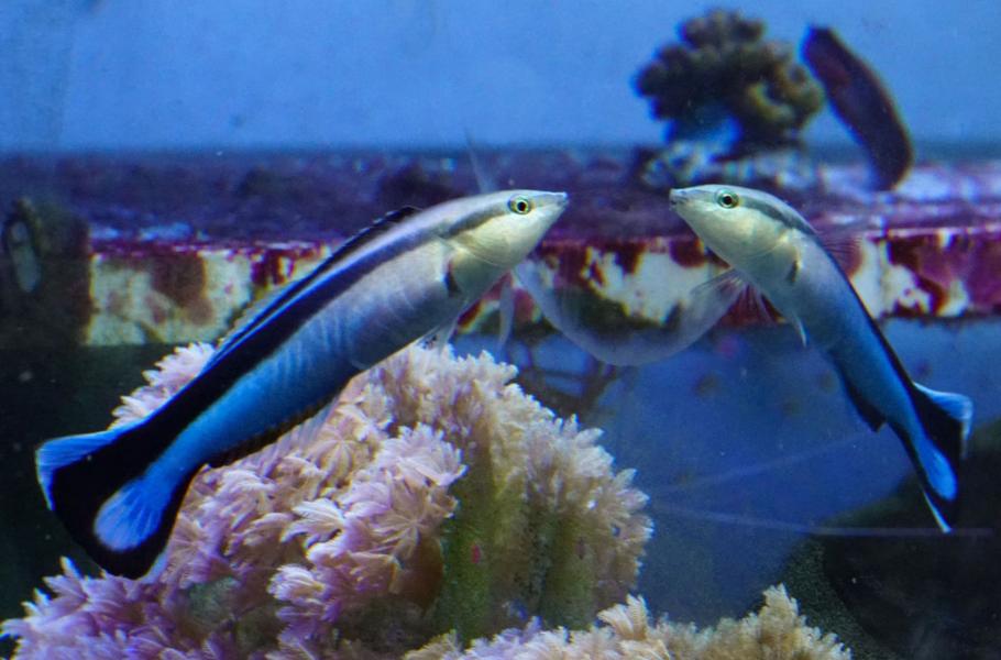 Pyskoun rozpůlený (Labroides dimidiatus) dorůstá délky kolem 10 centimetrů. Žije v mořích od pobřeží východní Afriky až po Pacifik. Živí se parazity, které odstraňuje z kůže jiným rybám. (foto: Max Plant Institute, Alex Jordan, CC BY-SA 4.0)