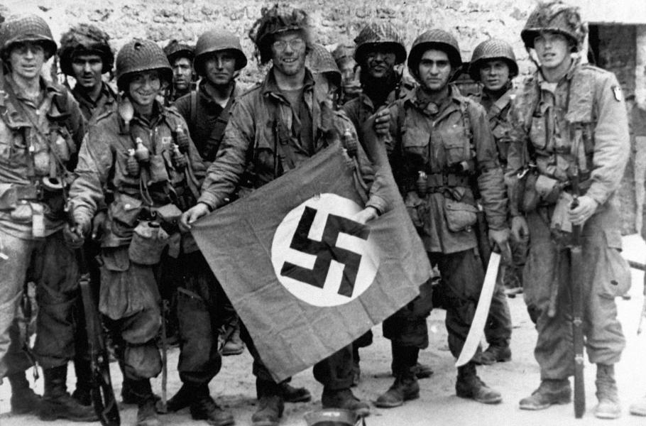 Američtí výsadkáři s ukořistěnou vlajkou v Normandii, i přes řadu potíží většinu úkolů nakonec splnili. (foto: Wikimedia Commons, Wolfgang Wolny, CC0)