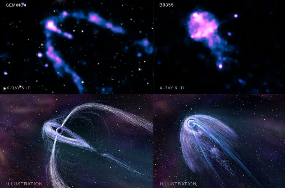 Badatelé prostudovali dva specifické objekty – pulsary Geminga a BO355+54. Tyto pulsary jsou si v mnohém podobné. Oba dva rotují rychlostí zhruba 5 otoček za sekundu a oba dva také vznikly asi před půl milionem let.