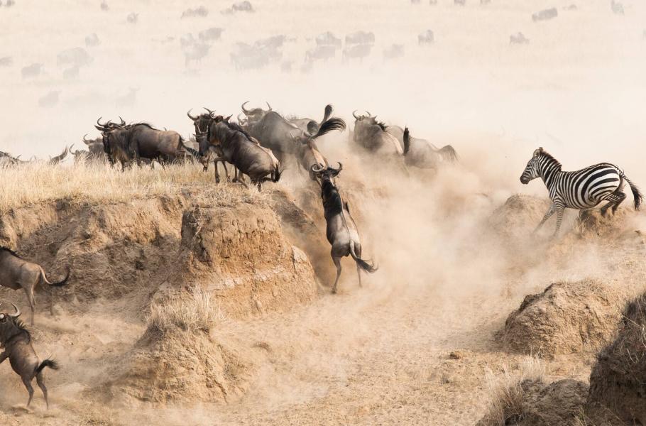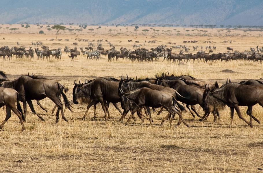 Je konec července a vrcholky pohoří Olololo nabízejí výborný výhled. Tam, kde se rozlehlé pláně Masai Mara střetávají s obzorem, se náhle vyhoupne hnědavá tečka a vzápětí další a další. V záplavě prachu se pak jednotlivé body slijí do jediné, zdánlivě nekonečné linie.