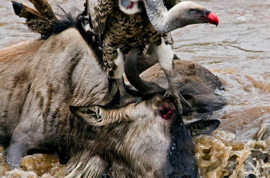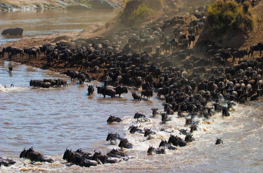 Nervozita ve stádě se mezitím vystupňovala na nejvyšší možnou mez. Pakoně se shlukli do obrovského chumlu a tlačí přední řady nebezpečně blízko vysokého srázu. Několik zvířat tlačenici nezvládá a padá do úzké průrvy, která se tak stává nebezpečnou pastí. Hlasité pobekávání nabývá na intenzitě, která má přimět k činu prvního odvážlivce, jenž se vrhne z vysokého břehu do kalné vody. Jakmile se najde, budou jej ostatní bezhlavě následovat, bez ohledu na to, kam dopadnou. Někdy to mohou být hřbety druhů, kteří se do vody vrhli před nimi, jindy mělký úsek řeky s trčícími balvany, o které si zvířata zlámou nohy. Po velkých přechodech bývá řeka poseta desítkami mrtvých či umírajících zvířat, nad kterými se s vidinou bohaté hostiny slétají mrchožrouti…
