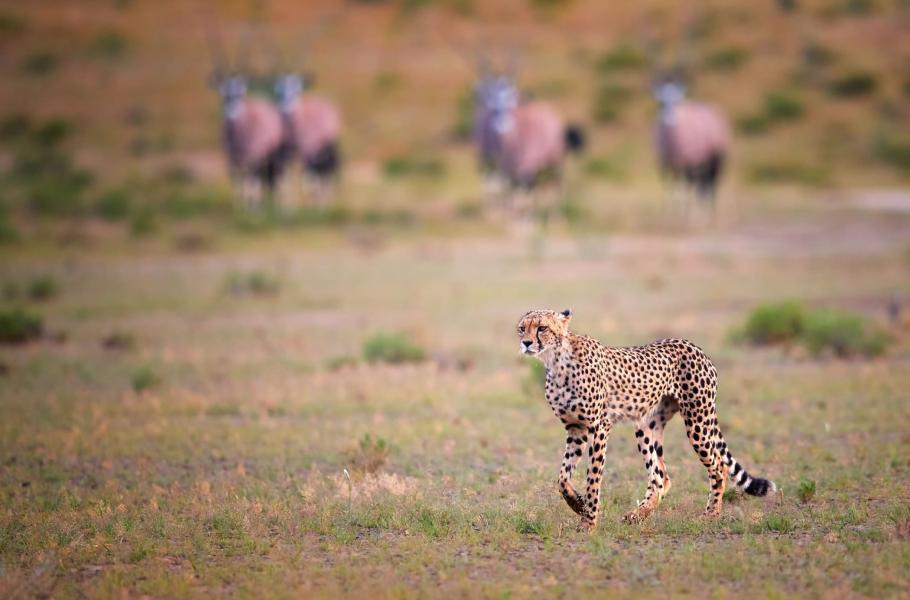 Specifický ekosystém Kgalagadi nabízí pohled na život přizpůsobený pouštním a polopouštním podmínkám. Rudé duny poprášené žlutě kvetoucím kotvičníkem v kontrastu modré oblohy a se stádem přímorožců nebo hlídkujícím gepardem na vrcholu, smečka lvů na lovu údolím, rodinka koček plavých, křehké antilopy i levhart na čekané. Večer dech beroucí západy slunce a noční divadlo na obloze.