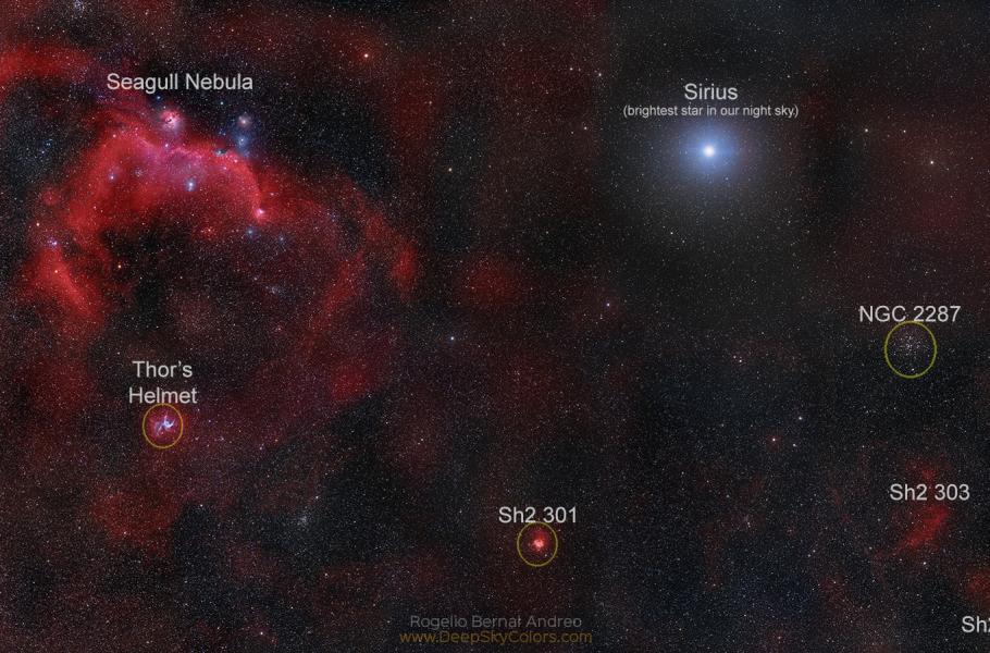 Jasná modrá hvězda vpravo od středu je Sirius – alfa Canis Major a nejjasnější hvězda noční pozemské oblohy. Sirius najdete na nebi v souhvězdí Velkého psa, ve vesmírném prostoru se však nachází 8,6 světelného roku daleko od Země. V porovnání s většinou ostatních hvězd tedy doslova za rohem. Kromě ní je na snímku patrná i hvězdokupa Messier 41, též známá jako NGC 2287, a Thorova přilba – bublina kterou z molekulárního mračna vyfoukl svým hvězdným větrem žhavý obr – Wolf-Rayetova hvězda.