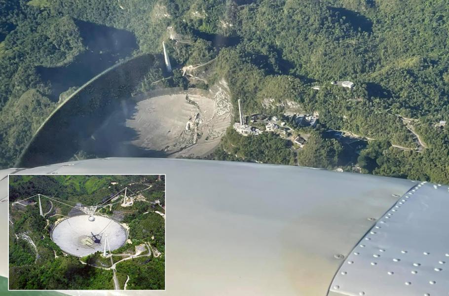 Již dříve poškozený obří radioteleskop u portorického města Arecibo se definitivně zhroutil. Plošina s anténami o váze 900 tun spadla z asi 120metrové výšky na hlavní odrazovou plochu.