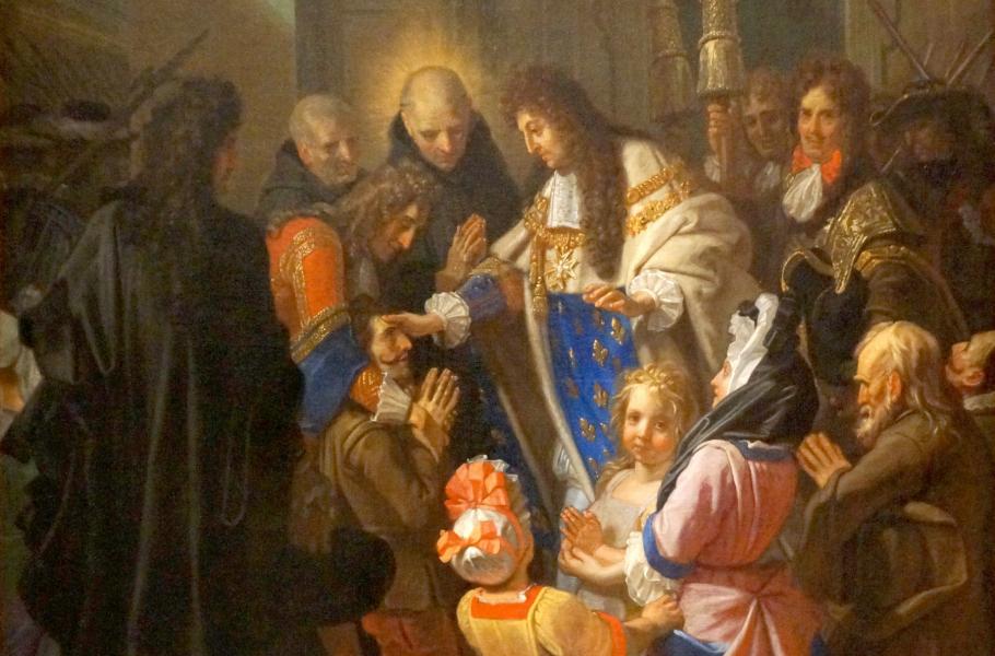 Muž trpící tuberkulózním neduhem je uzdraven francouzským králem Ludvíkem XIV. Plátno Jeana Jouveneta z roku 1690. (foto: Wikimedia Commons, G.Garitan, CC BY-SA 4.0)