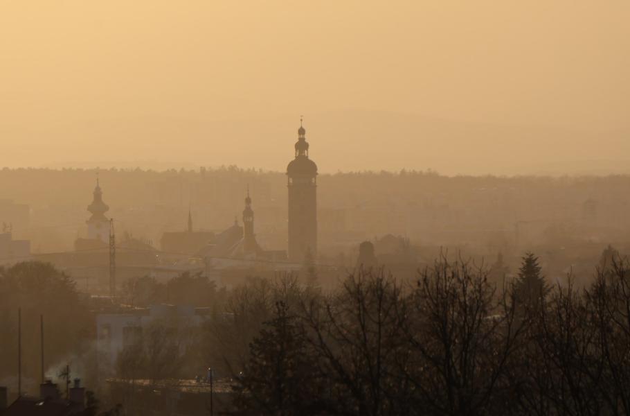 Katedrála sv. Mikuláše a Černá věž v Českých Budějovicích na konci března 2024, kdy Česko zasáhl saharský prach. (ilustrační foto: Profimedia/ČTK, Honza Ján)