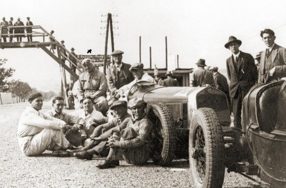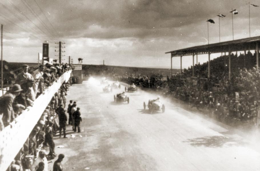 Odstartováno! Skupina vozů vyráží v mračnech prachu do prvních kilometrů Masarykova okruhu, 1931.