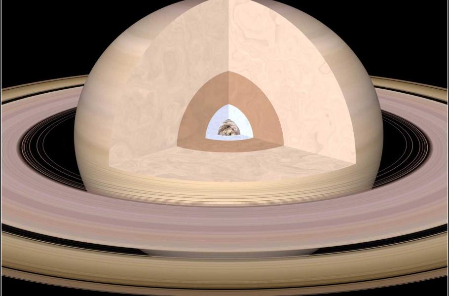 V samotném středu se pravděpodobně nachází kamenné jádro se značnou příměsí ledu, zasahující do vzdálenosti více než 12 000 km od středu planety. Jádro je obaleno vrstvou tekutého kovového vodíku – zde je nejspíš bohatě zastoupeno kapalné helium. Ještě výše se nachází vrstva kapalného molekulárního vodíku, v němž se s rostoucí výškou vytrácejí kovové vlastnosti.