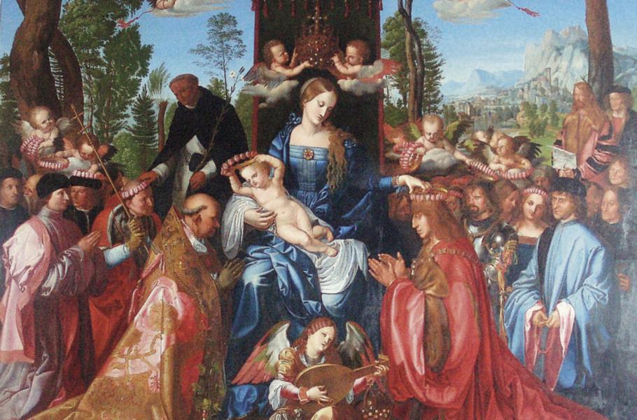 Tajemství slavné Dürerovy Růžencové slavnosti už dnes vlastně neexistuje, i když právě tento obraz je českému publiku nejpřístupnější: visí v Národní galerii. (zdroj: Wikimedia Commons, Albrecht Dürer, PDM 1.0)