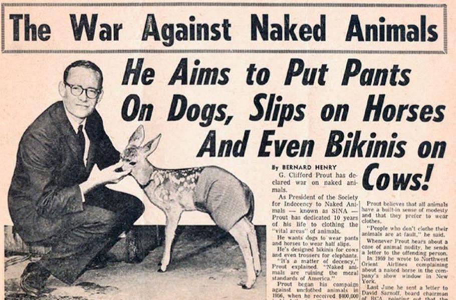 Moto amerického Hnutí proti obscénnosti nahých zvířat (SINA) znělo takto: Nahatý kůň je neslušný kůň. SINA (The Society for Indecency to Naked Animals) sice znamená Hnutí za obscénnost nahých zvířat místo proti, ale drobná chyba v názvu jeho příznivce nikdy neodradila. Členové hnutí žádali ošatit každé zvíře, od koček a psů po krávy i velryby, aby pohled na jejich přirození nezpůsoboval úpadek morálky ve společnosti.