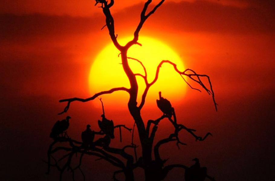 Na východě protnul černé nebe ohnivý blesk a husté mraky začaly plnit celou oblohu. Snažily se zatlačit slunce do úkrytu na druhé straně polokoule a nám se naskytl neopakovatelný úkaz. Sotva doutnající kotouč překryl strom s pospávajícími supy a černé siluety spolu s uschlými větvemi v pozadí a dohasínajícím denním poutníkem vytvořili kompozici, které nešlo odolat.