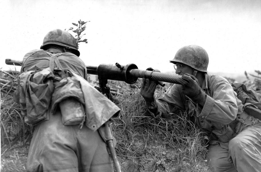 Obsluha při nabíjení své zbraně. Jde o příslušníky 383. pěšího pluku během bojů na Okinawě v červnu 1945. (foto: Wikimedia Commons, U.S. Army, PDM 1.0)